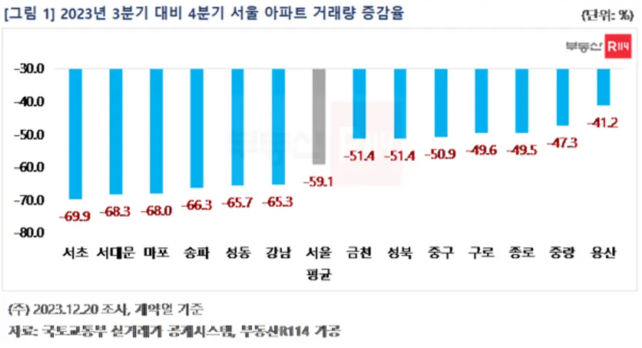 올해 4분기 서초구 아파트 거래량이 전분기 대비 약 70% 빠지는 등 서울 아파트 시장의 거래절벽이 심화되는 분위기다. 서울 아파트 매매시장은 단기 급등한 집값 피로감과 고금리로 인한 이자부담이 맞물리면서 매수 심리가 큰 폭으로 위축됐다.