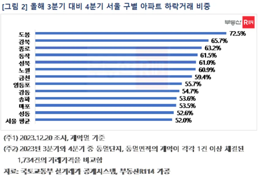 올해 10월 1일부터 12월 20일까지 매매계약이 1건 이상 체결된 서울 아파트(동일단지 및 동일면적 기준) 1734개의 실거래가 평균을 분석한 결과, 3분기 대비 가격이 하락한 거래는 901건(52%)으로, 상승 거래 730(42%)건에 비해 많았다. 지역별로는 △도봉(72.5%) △강북(65.7%) △종로(63.2%) △동작(61.5%) △성북(61.0%) 등 대체로 중저가 지역에서 하락거래 비중이 높았다.