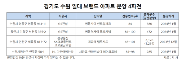 연말과 연초는 청약 예비 수요자들의 관심이 덜해 아파트 분양을 꺼리는 시기이지만 최근 수원시는분양 마케팅 열기가 뜨겁다. 경기도 수원시 일대에서 4개 단지 2571가구의 아파트가 일반분양을 준비하고 있다.