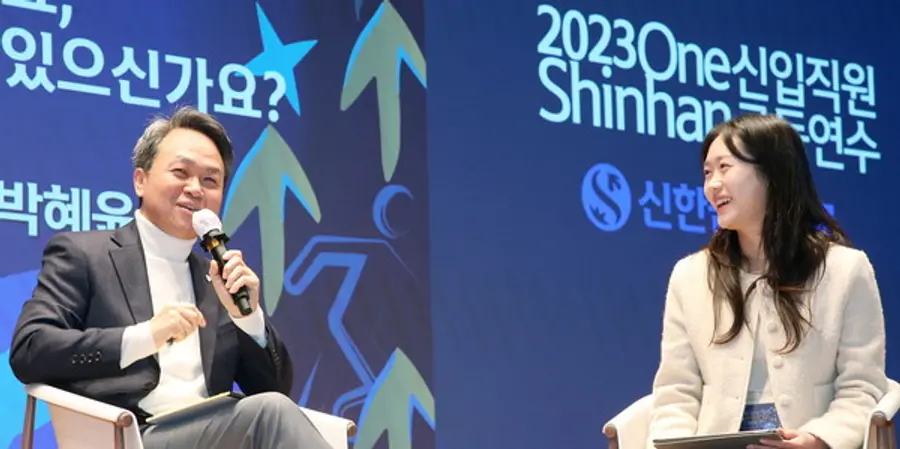 진옥동 회장이 그룹 연수 이틀째인 지난 27일 신한은행 블루캠퍼스를 찾아 신입사원들과 토크 콘서트와 질의 응답 시간도 가졌다.