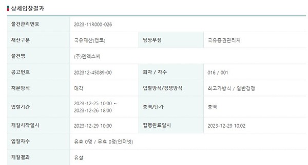 29일 한국자산관리공사(캠코)의 온라인공매시스템 온비드에 따르면 NXC 지분 85만1968주(지분율 29.3%)에 대한 2차 유효 입찰 참가자가 단 1명도 나타나지 않았다.