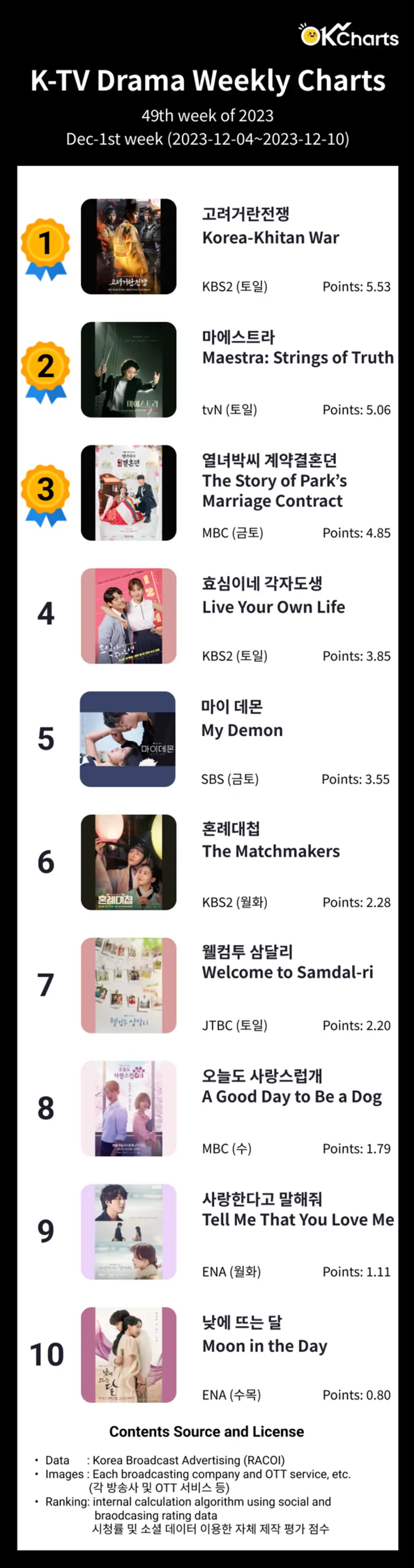 12월1째주 TV 드라마 순위 차트입니다. 1위 고려거란전쟁, 2위 마에스트라, 3위 열녀박씨계약 혼뎐 입니다. 이영애 주연의 '마에스트라'가 첫주부터 2위를 차지하였습니다.