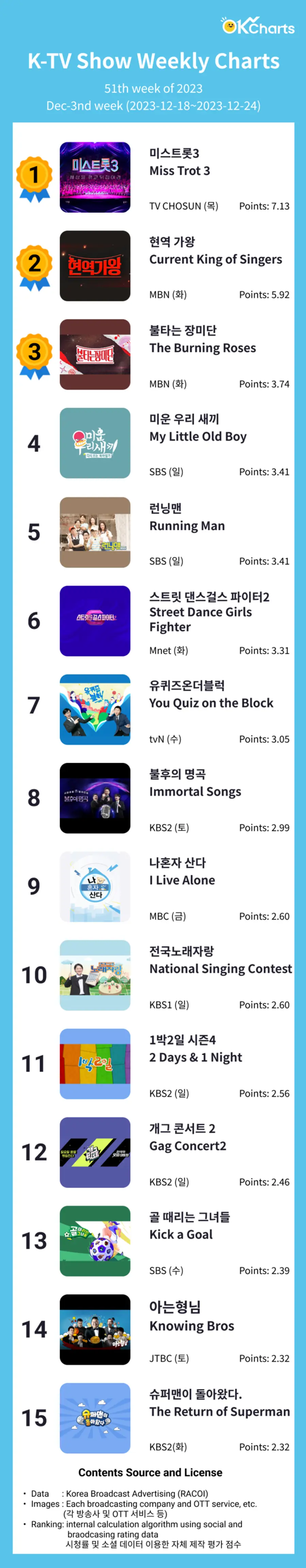 12월 셋째 주 오케이 차트 TV 예능 순위입니다.