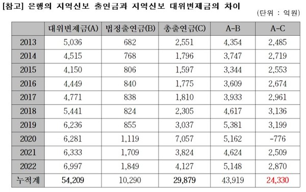 "지난 10년간 은행이 지역신보에 출연한 전체 출연금이 2조9879억원인데 반해 (신보) 보증부대출 부실로 인해 지역신보가 은행에 대신 갚아준 대위변제금은 같은 기간 5조4209 억원에 달해 은행이 얻은 수익이 약 2조4천억원에 달하는 것으로 조사됐다"