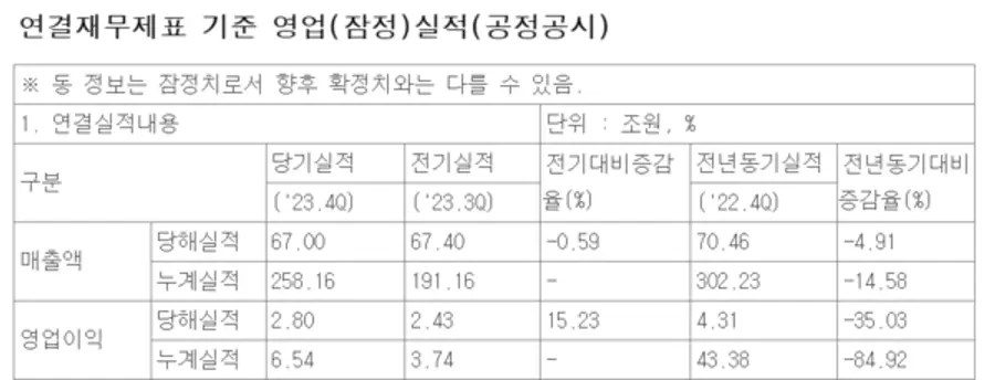 잠정 실적은 한국채택 국제회계기준(IFRS)에 의거해 추정한 결과이며, 아직 결산이 종료되지 않은 가운데 투자자들의 편의를 돕는 차원에서 제공되는 것이다.