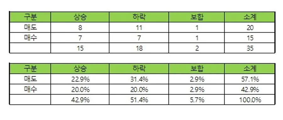 하락시 매도가 11회로 매수 7회를 소폭 웃돌았다. 주가가 제자리 걸음한 날에도 각각 1차례씩 매도와 매수하면서 관련 수수료만 낭비했다는 지적을 피하기 어렵다.