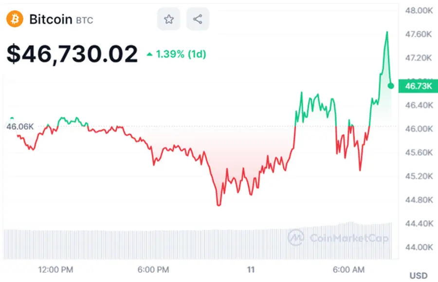 비트코인은 오전 8시 20분경 4만7647.22달러까지 뛰었다가 4만6000달러선에서 거래됐다.