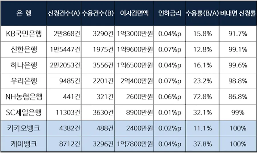 다른 은행들도 이와 크게 다르지 않다. 지난해 상반기 카카오뱅크의 인하금리는 평균 0.02%포인트에 불과하다. 게다가 10명이 신청하면 1명만 받아줬다. 수용률은 11.1%에 불과하다.