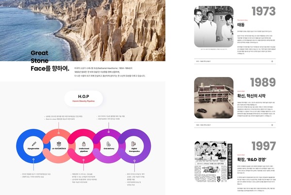 세부 메뉴 중 ‘연혁’은 한미의 50년 역사 흐름을 알 수 있는 대표적 사건들을 테마로 삼아 한미의 성장과 도약을 스토리텔링 방식으로 표현했다.