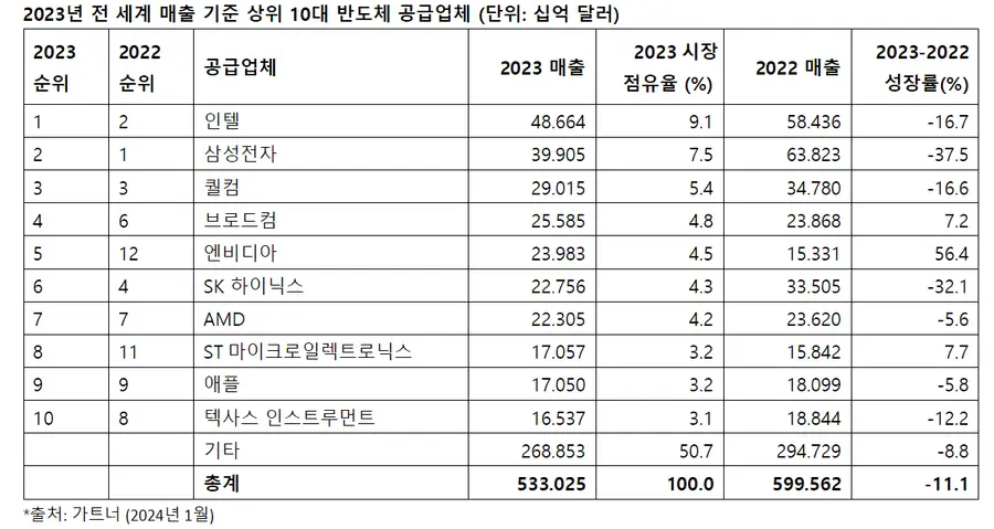 작년 반도체 업계 전체 매출은 전년보다 줄었다. 삼성전자, SK하이닉스, 인텔 등을 포함한 전 세계 반도체 제조사 톱 10 매출 합계는 5330억2500만달러로 2022년보다 11.1% 줄었다.