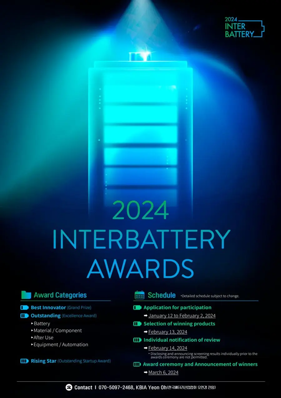 한국배터리산업협회는 올해 열리는 국내 최대 배터리 전시회 '인터배터리 2024'에 '인터배터리 어워즈'를 신설한다고 19일 밝혔다.