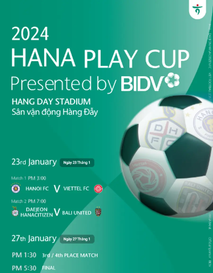 23일 오후 3시(현지시간) '하노이FC'와 '비엣텔FC'의 첫 경기를 시작으로 27일 오후 5시30분(현지시간) 결승전이 진행되며, 스카이스포츠를 통해 '대전하나시티즌'의 경기가 생중계되어 국내 축구 팬들도 생생하게 『BIDV 초청 하나플레이컵』을 즐길 수 있다.