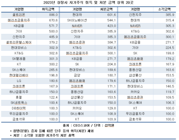 24일 기업데이터연구소 CEO스코어(대표 김경준)가 2021년에서 2023년까지 자기주식 취득 및 처분 공시를 제출한 국내 상장사를 조사한 결과, 지난해 상장사의 자기주식 취득 금액은 8조3519억원, 소각 금액은 4조7626억원에 달했다.