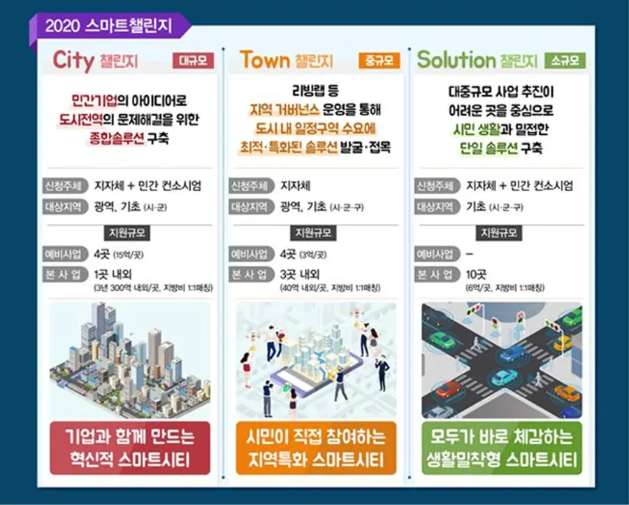 이 사업은 사업 규모에 따라 (大)시티-(中)타운-(小)솔루션 등 3개 유형으로 구성되어 있으며, 각 유형별로 지원 규모, 사업 범위, 솔루션 규모 등을 차별화하였으며, 사업별 주요내용은 다음과 같다.