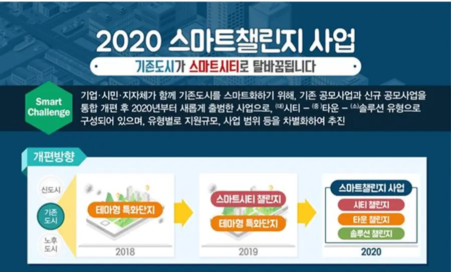 먼저 시티 챌린지는 대·중소기업, 새싹기업 등 민간이 보유한 혁신적인 아이디어를 활용하여 도시 전역의 문제를 해결하기 위한 종합적인 솔루션을 개발하고, 이를 도시 곳곳에 총 집약하는 사업이다.