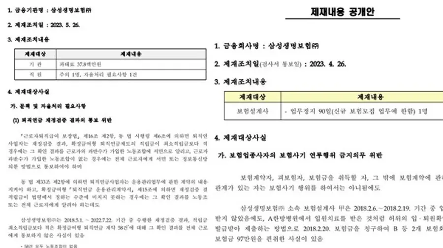 24일 금감원에 따르면, 삼성생명과 삼성화재는 작년 한 해 금감원으로부터 각각 6차례씩 제재받았다. 같은 기간 생손보업계 2위권 사업자인 한화생명은 4회, 현대해상과 DB손보는 각각 3회에 그쳤다.