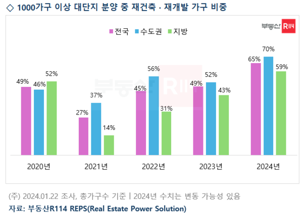 서울과 경기에서는 3만 가구 이상이 재건축·재개발 대단지로 계획중이다. 올해 수도권에서 분양예정인 대단지 아파트는 10만 3014가구로 이 중 재건축·재개발 아파트는 7만1763가구로 전체의 70%를 차지한다. 지방은 7만2626가구 중 59%인 4만3117가구가 재건축·재개발로 공급된다. 1000가구 이상 분양 물량에서 컨소시엄으로 짓는 아파트 비중은 최근 들어 높아지는 추세다. 2021년 31.8%(14만6255가구 중 4만6,492가구)에서 2023년 39.7%(10만1718가구 중 4만423가구)로 높아졌다.