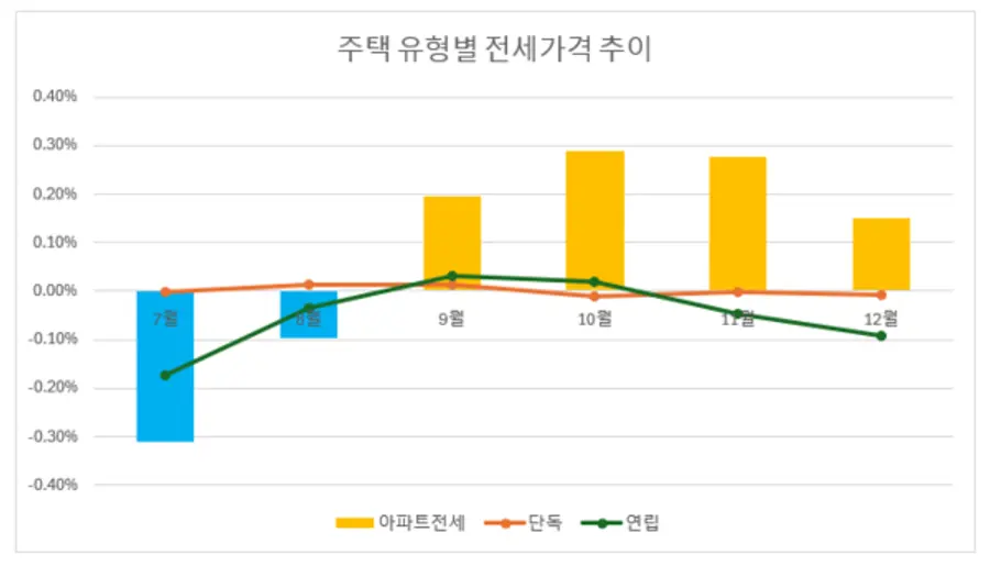 30일 국민은행 부동산 시계열자료에 따르면 2023년 초부터 하락세를 보이던 전국 아파트 전세가격은 9월 0.02% 상승 반전을 한 이후 10월 0.29% 11월 0.28% 12월 0.15% 등으로 상승세를 유지하고 있다. 반면 연립주택 전세가격은 9~10월 2개월 상승한 이후 하락 전환했으며 단독주택 전세 가격은 10월 이후 하락세가 이어지고 있다.