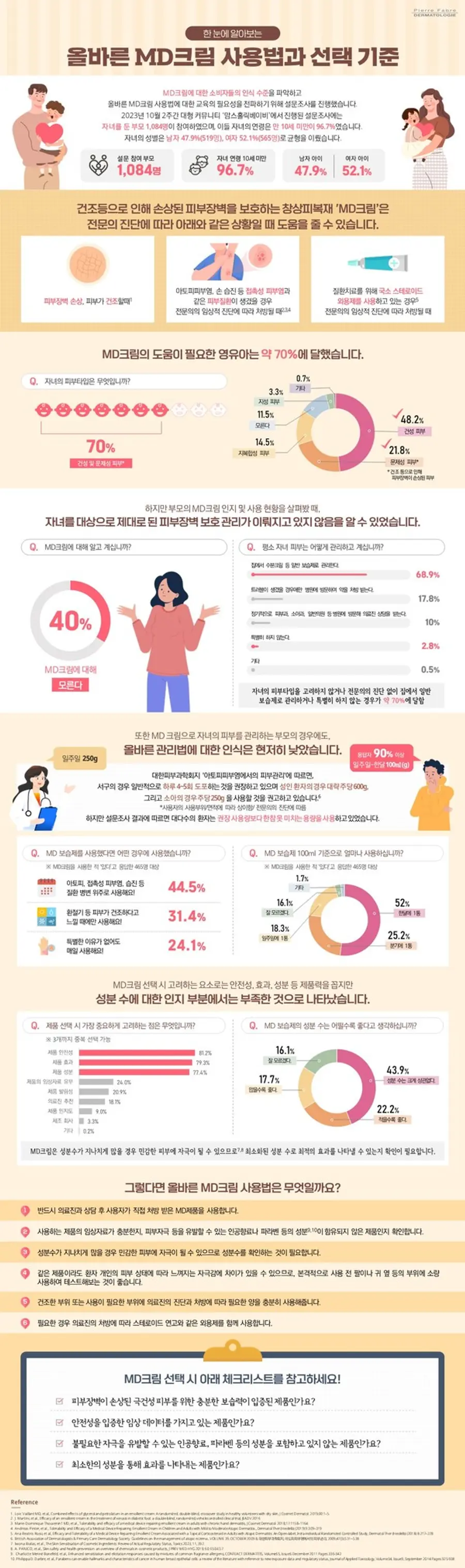 이번 인포그래픽은 MD크림 주 사용군인 영유아 부모를 대상으로 진행한 설문조사 결과를 바탕으로 제작되었다. 작년 10월 2주 간 대형 커뮤니티 ‘맘스홀릭베이비’에서 진행된 설문조사에는 영유아 자녀를 둔 부모 1084명이 참여했으며, 이들 자녀의 연령은 만 10세 미만이 약 97%에 달했다.