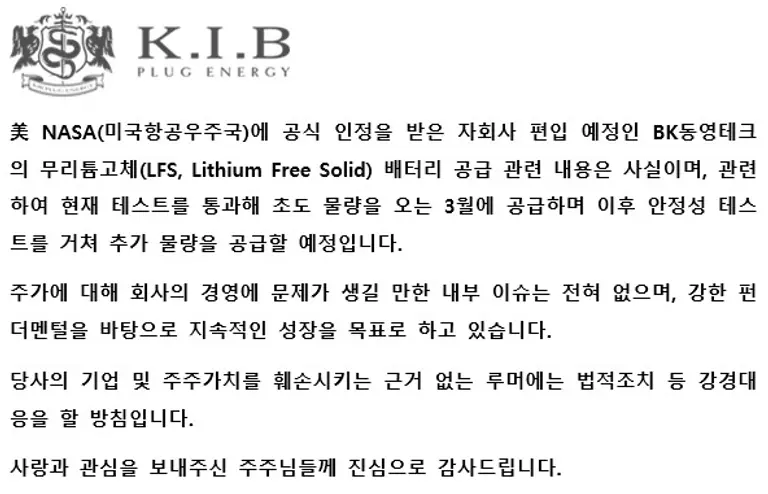 KIB플러그에너지는 특히 자회사로 편입 예정인 BK동영테크가 미국 NASA의 전고체 배터리 공식 테스트를 통과, 다음달 본격 납품한다는 소식이 전해진 뒤 하한가로 추락, 투자자들을 어리둥절하게 하고 있다.