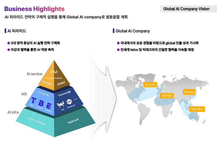 SKT는 AI 사업의 글로벌 확장에 있어서도 AI 데이터센터, AI반도체, telco 특화 LLM 사업, 엑스칼리버(X Caliber) AI 솔루션 등의 영역에서 연내 구체적인 성과를 창출한다는 목표다.