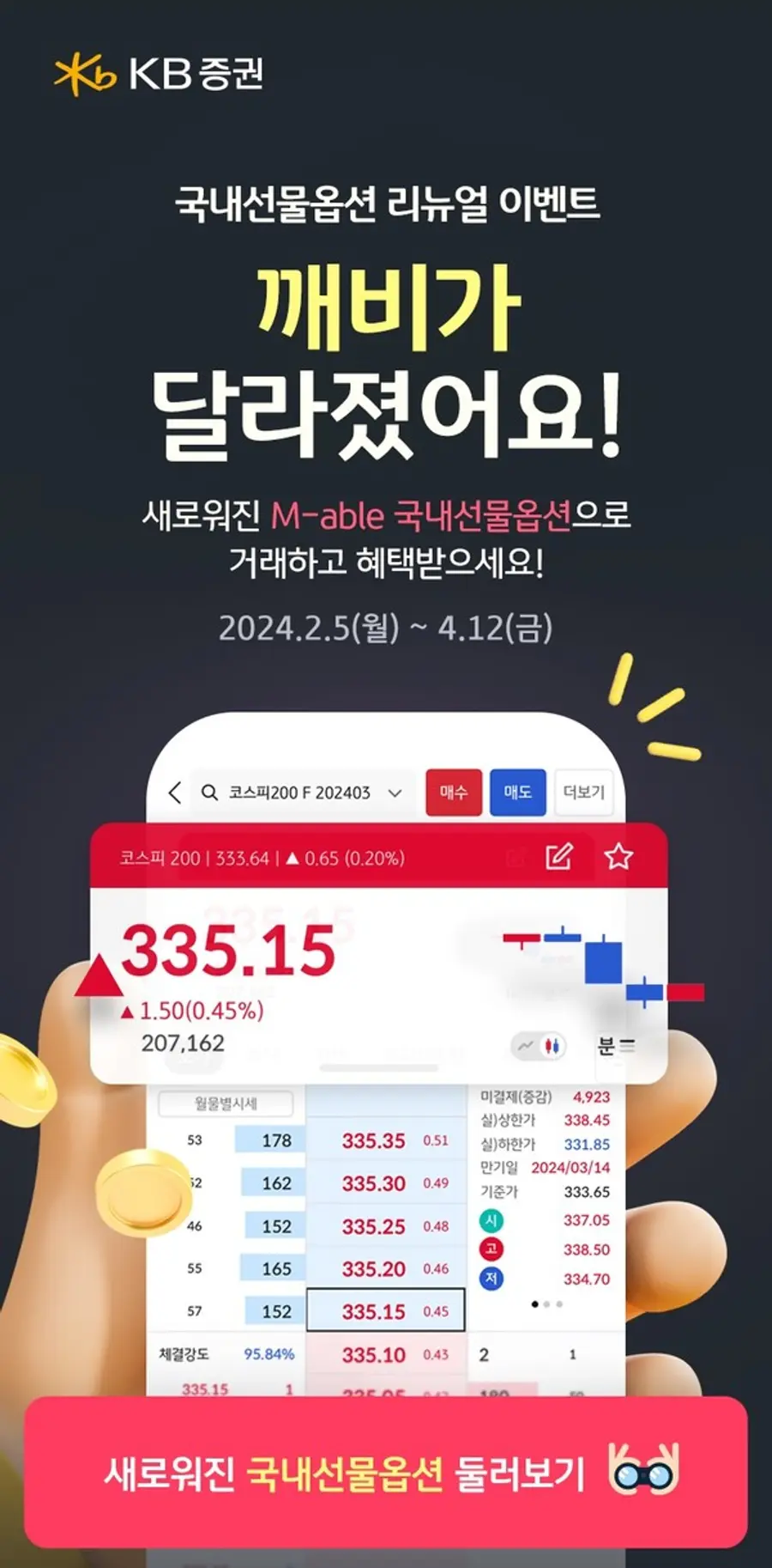 KB증권은 MTS ‘KB M-able(마블)’내에 국내선물옵션 화면 리뉴얼을 기념하여 오는 4월 12일까지 ‘깨비가 달라졌어요’ 이벤트를 진행한다고 6일 밝혔다.