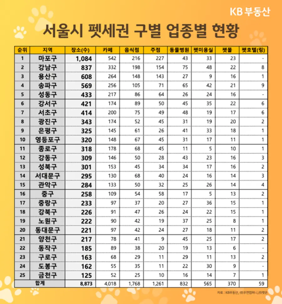 KB부동산이 서울시 펫세권 업체 8873곳의 업종별 현황을 분석한 결과 ▲마포구(1084개) ▲강남구(837개) ▲용산구(608개) ▲송파구(569개) ▲성동구(433개) ▲강서구(421개) ▲서초구(414개) ▲광진구(343개) ▲은평구(325개) ▲영등포구(320개) 등의 순으로 펫세권 업종이 밀집한 것으로 나타났다.