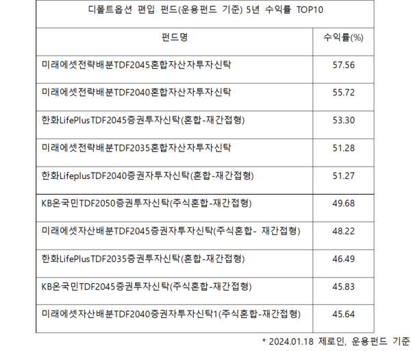 디폴트옵션에 편입된 펀드의 5년 수익률을 분석한 결과 85개 펀드 중 미래에셋자산운용의 TDF가 1, 2위를 차지했다. ‘미래에셋전략배분TDF2045’이 57.56%로 가장 높은 수익률을 기록했다.