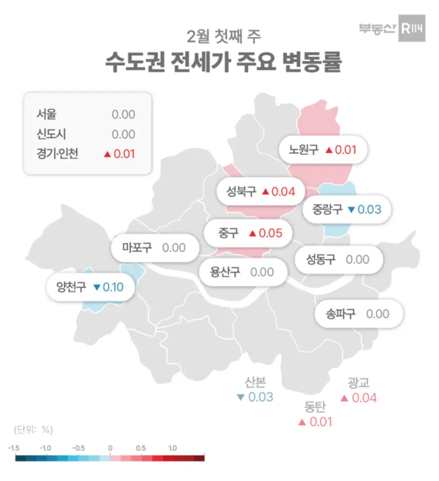 서울은 △중구(0.05%) △종로(0.05%) △성북(0.04%) △노원(0.01%) 등이 올랐고 △양천(-0.10%) △중랑(-0.03%)은 구축 위주로 내렸다. 신도시는 △광교(0.04%) △동탄(0.01%) 등 2기 신도시가 올랐고, △산본(-0.03%)은 떨어졌다.