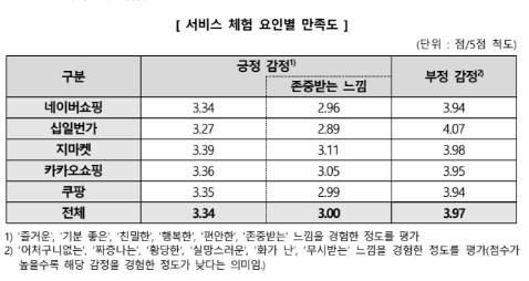 온라인서비스 체험 요인별 만족도에서 11번가에 대한 부정적 감정이 5점중 4.07로 가장 높았다. 쿠팡과 네이버쇼핑은 각각 3.97로 상대적으로 11번가에 비해 낮았지만 이들 상위 5개 온라인쇼핑몰에 대한 부정적 척도가 평균 3.97에 달할 정도로 높았다. 긍정적평점(3.34)에 비해 부정적인 점수가 상대적으로 높게 나타났다.