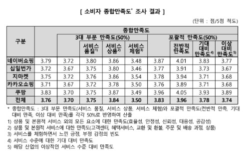 소비자 종합만족도 조사에서는 쿠팡이 5점중 3.83점으로 가장 높았다. 네이버쇼핑(3.79)이 뒤를 이었다. 지마켓(3.75), 11번가(3.72)와 카카오쇼핑(3.71점)으로 전체평균점수(3.76점)를 갉아먹었다.