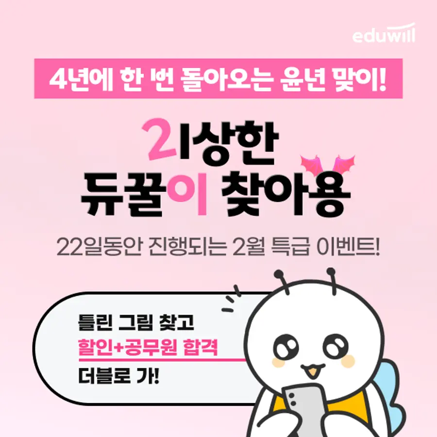 틀린 그림을 찾은 참여자 전원에게 9급공무원 인강 9만원 할인 쿠폰을 증정한다. ‘9급 행정직 전 직렬 100%환급 합격패스’와 ‘평생패스’ 수강 시 사용할 수 있다. 합격패스의 경우 2월 기본 35만원 할인에 9만원을 더하면 총 44만원의 할인 혜택을 받을 수 있는 기회로 최저가 수강이 가능하다.