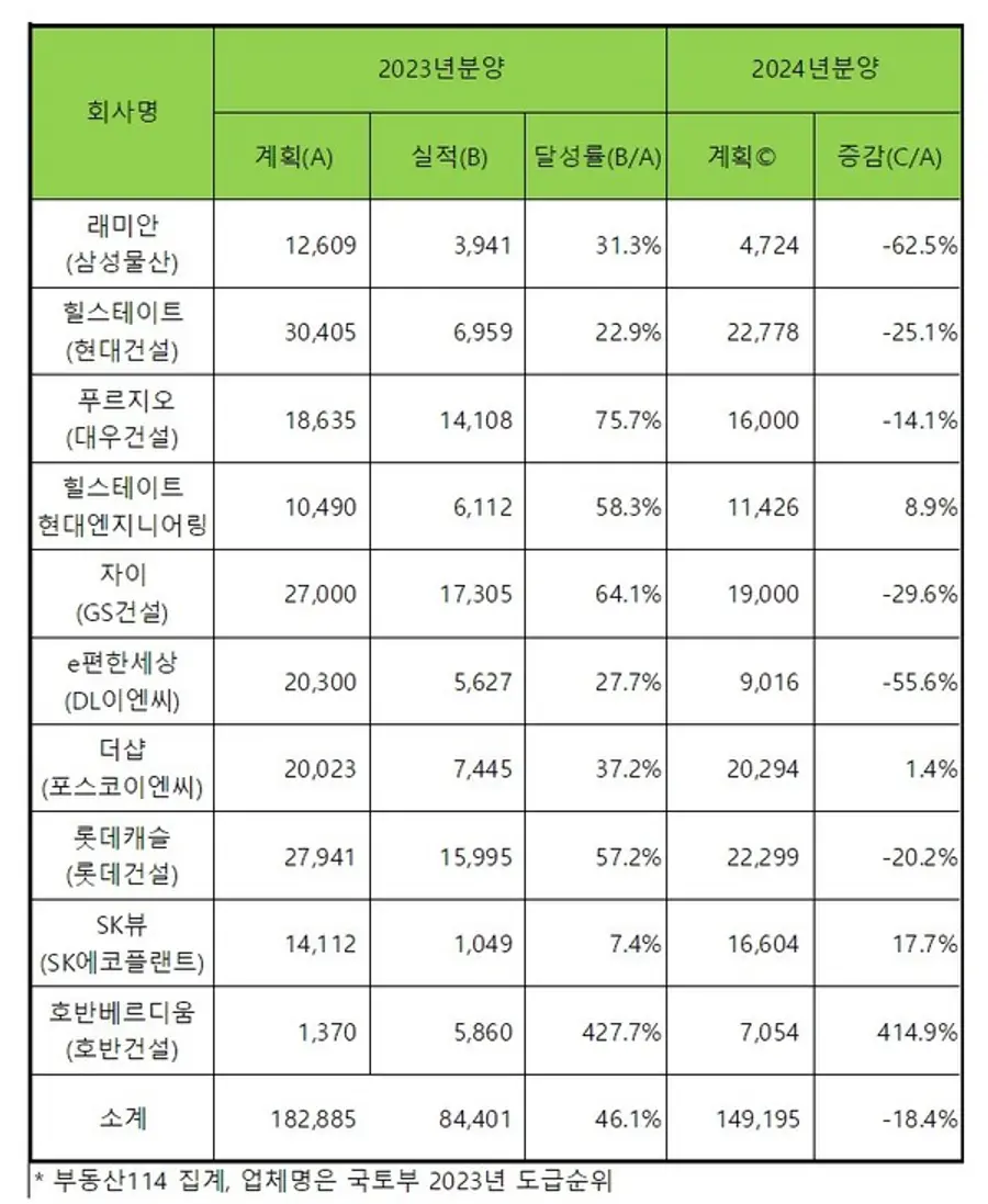 지난해 부동산프로젝트(PF) 시장 부실 여파로 10대 건설사의 아파트 분양 실적이 연초 계획한 물량 대비 절반에도 못 미친 것으로 나타났다.