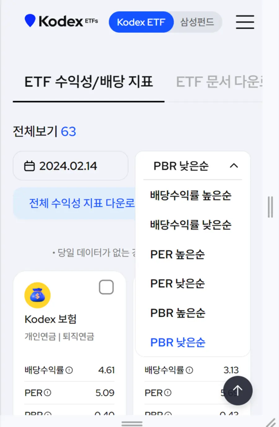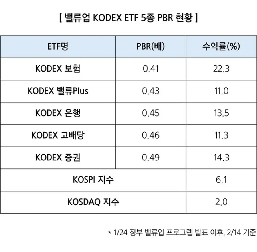 삼성자산운용은 KODEX 국내 ETF 가운데 PBR이 0.5배 미만인 KODEX 보험(0.41배), KODEX 밸류Plus(0.43배), KODEX 은행(0.45배), KODEX 고배당(0.46배), KODEX 증권(0.49배) 등 5개를 주요 ‘기업 밸류업 프로그램’ 수혜 상품으로 제시했다.