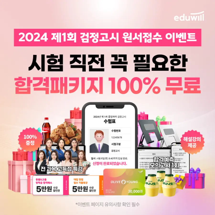 2024년도 제1회 검정고시 시험은 4월 6일 전국 고사장에서 시행된다. 에듀윌은 중졸 및 고졸 졸업학력 검정고시 시험 접수자가 원서접수 인증시 시험 직전 꼭 필요한 합격 패키지를 선물한다. 아울러 럭키박스 추첨을 통해 푸짐한 경품도 증정한다.