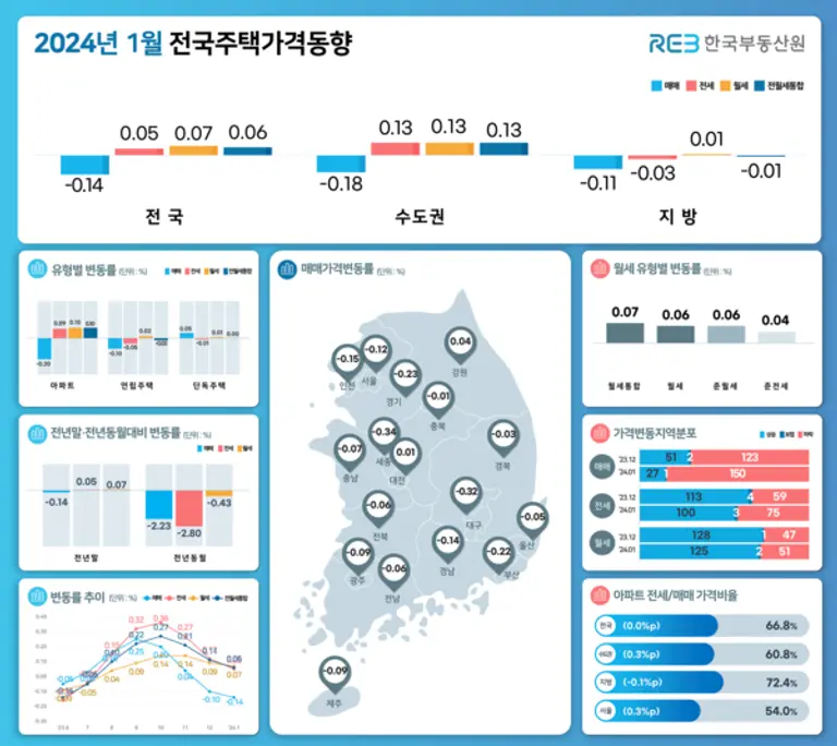 15일 한국부동산원이 발표한 '전국주택가격동향조사'에 따르면 올해 1월 전국 주택종합 매매가격은 평균 0.14% 하락해 전월 대비(-0.10%) 하락폭이 확대된 것으로 나타났다. 수도권(-0.14%→-0.18%)과 지방(-0.07%→-0.11%) 모두 전달에 비해 하락폭이 커졌다.