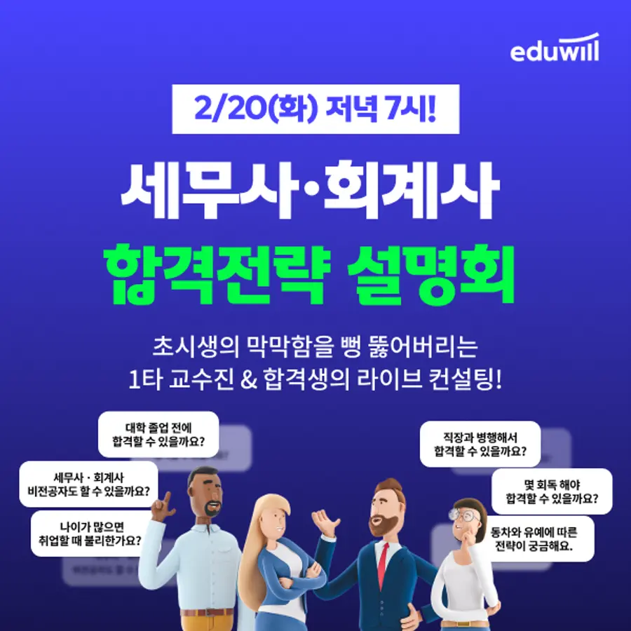 오후 8시부터 9시까지는 세무사 초시생 필수 정보인 시험제도와 합격자 빅데이터 분석에 근거한 세무사 합격 전략을 소개한다. 각 설명회 말미에는 교수진과 합격생이 직접 참여해 실시간 고민 해결과 함께 실질적인 컨설팅이 이어진다.