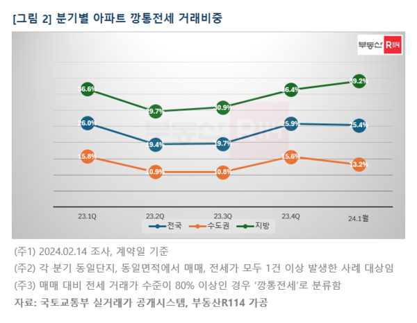 전국 아파트 실거래 자료를 통해 매매 대비 전세가격 비율이 80% 이상으로 ‘깡통전세’가 의심되는 거래비중을 살펴보면 2023년 2분기 19.4%(2만4152건 중 4691건)에서 4분기 25.9%(2만1560건 중 5594건)으로 6.5%P 늘었다.