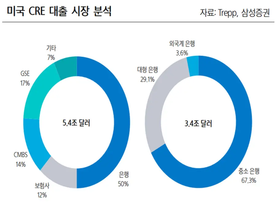 삼성증권은 지난 16일 부동산·금융 섹터 보고서에서 "해외 상업용부동산(CRE) 영향은 대형 금융지주를 중심으로 실적에 부담으로 작용 가능하다"면서도 "다만 국내 금융지주들의 손실은 해외 은행들에 비해 제한적일 전망"이라고 예상했다.