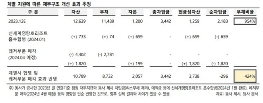 재무구조 개선을 위해 신세계영랑호리조트 흡수합병과 레저부문 매각 등 계획된 재무구조 개선안을 단순 반영하더라도 부채비율은 424%. 여전히 동종업계 등에 비해 상대적으로 높은 수준이다.