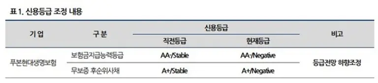 나이스신용평가는 21일 푸본현대생명보험의 장기신용등급 전망을 종전 '안정적'에서 '부정적'으로 하향조정했다.