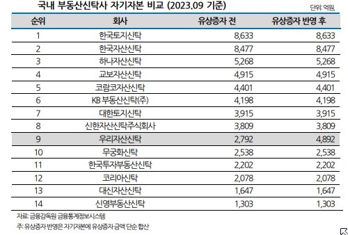 23일 나이스신용평가에 따르면, 지난해 9월말 기준 우리자산신탁의 자기자본(자본금)은 2792억원으로 국내에서 영업중인 14개 신탁사 중 자기자본 규모 9위를 기록중이다. 여기에 증자대금(2100억원)을 단순 합산할 경우, 자기자본이 4892억원으로 두 배 가량 불어나 업계내 5위권으로 뛰어오를 전망이다.