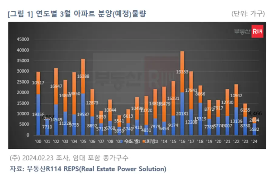 26일 부동산R114에 따르면 올해 전국에서 계획된 아파트 분양물량은 8466가구로 2001년 7987가구 이후 동월기준 가장 적다. 청약제도 개선으로 3월 4일부터 22일까지 약 3주동안 청약홈이 개편이 진행되고 4월 총선을 앞두고 건설사가 분양을 꺼리고 있기 때문이다.