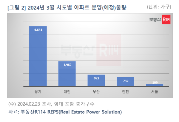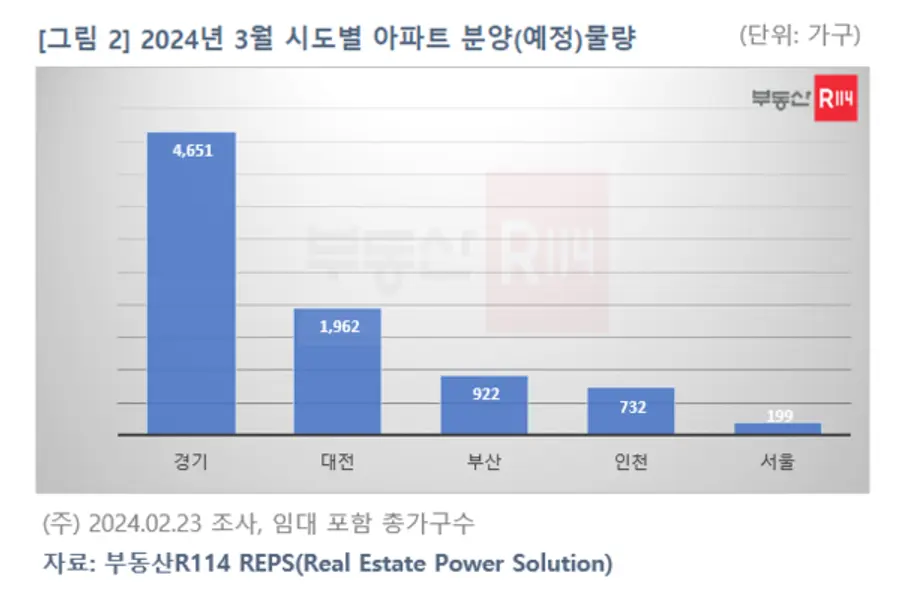 권역별로 수도권 5582가구, 지방 2884가구가 공급될 예정으로 분양시장은 성수기답지 않은 조용한 분위기가 예상된다. 시도별 분양예정 물량은 △경기(4651가구) △대전(1962가구) △부산(922가구) △인천(732가구) △서울(199가구)로 그 외 지역에서는 계획된 물량이 전무하다.
