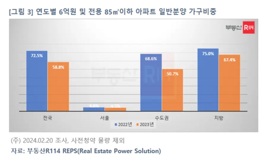 부동산R114가 최근 2년 전국 아파트 일반분양(사전청약 제외) 물량 가운데 6억원, 전용 85㎡이하 가구비중을 살펴본 결과, 2022년 72.5%(22만487가구 15만9801가구)에서 2023년 58.8%(13만4,387가구 중 7만9,084가구)로 13.7%P 줄었다. 원자재값과 인건비 등 건축비 상승과 고분양가 규제완화 등으로 분양가가 오른 영향이 크다. 특히 서울은 청년주택드림대출 대상이 되는 아파트 가구비중이 4%대에 불과해 서울보다는 수도권이나 지방에서 통장 활용도가 높을 것으로 예상된다.