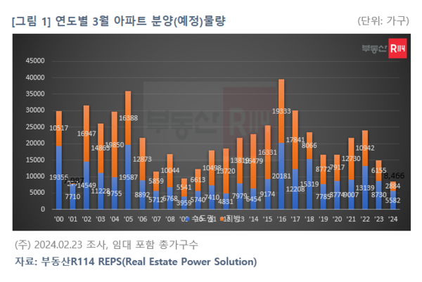 부동산R114 여경희 수석연구원은 "3월 계획물량이 1만 가구 수준으로 적은 양이지만 청약시장이 잠시 멈추면서 계획보다 실적은 더 낮아질 가능성도 있다"며 "4월 총선과 가정의 달인 5월 연휴 여파로 관심이 분산될 수 있어 5월초 이후에 봄 분양시장이 본격화될 전망이다."고 말했다.