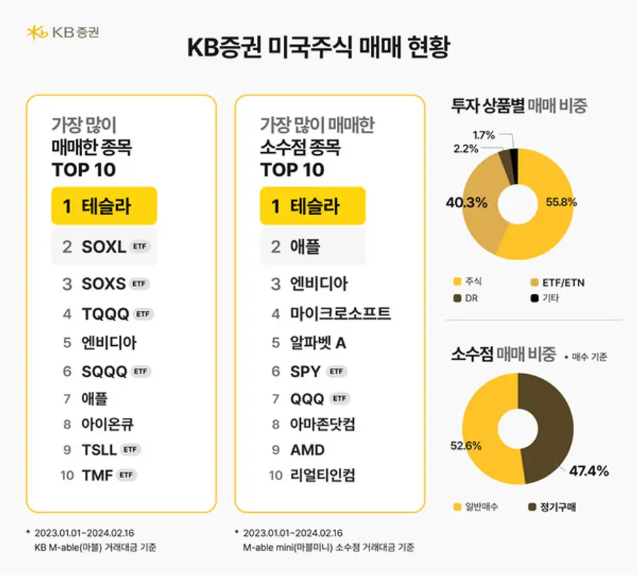 KB증권은 작년 1월부터 올해 2월 16일까지 KB증권 MTS ‘KB M-able(마블)’과 ‘M-able mini(마블미니)’를 통해 고객들이 가장 많이 매매한 미국주식의 종목 현황을 분석한 결과를 28일 공개했다.