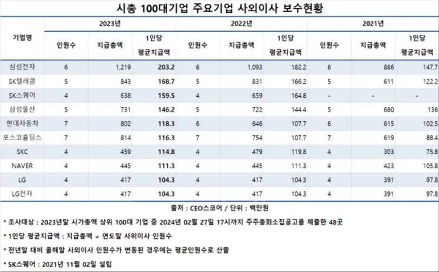 28일 기업데이터연구소 CEO스코어(대표 김경준)가 지난 2023년 말 기준 시가총액 100대 기업 중 27일 오후 5시까지 주주총회소집공고를 제출한 48곳의 사외이사 보수현황을 조사한 결과, 삼성전자 사외이사 1인당 평균 보수는 전년 1억8220만원보다 11.5% 오른 2억320만원으로 조사 대상 중 유일하게 2억원을 넘겼다.