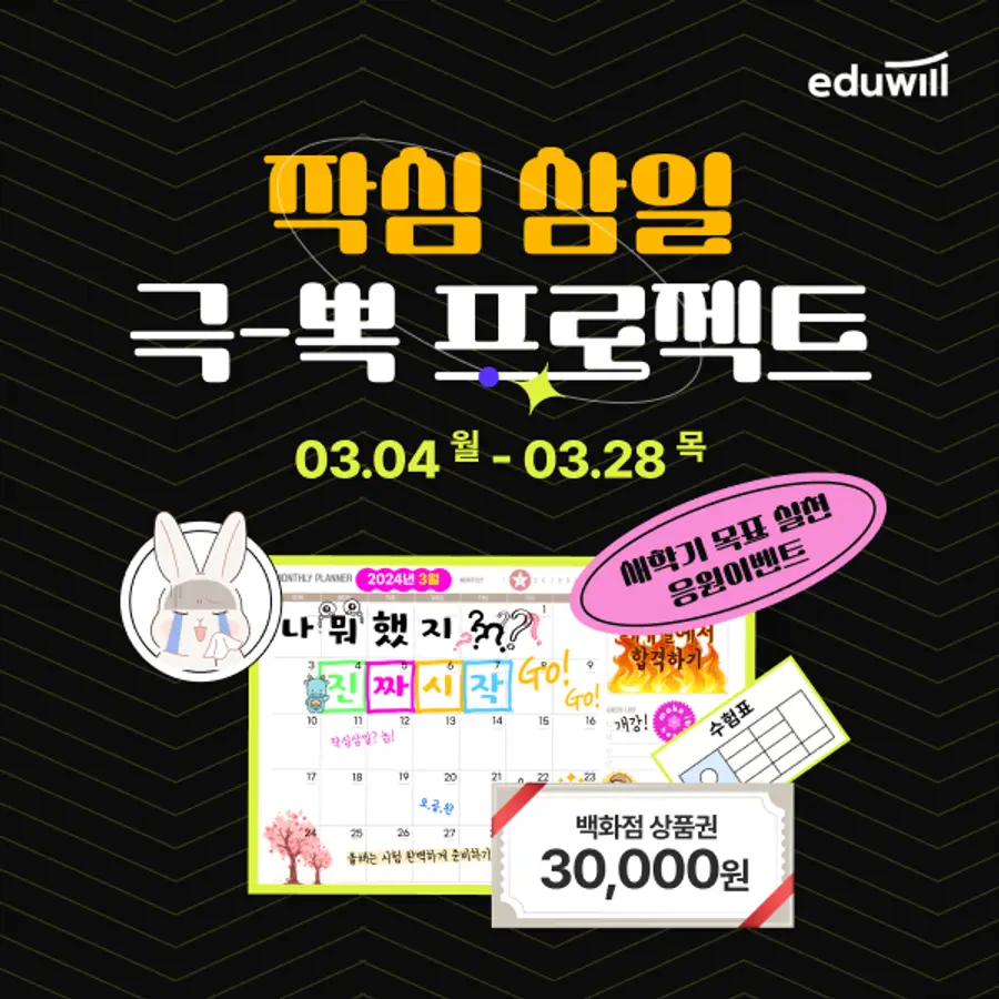 종합교육기업 에듀윌이 9급공무원 수험생들을 대상으로 3월 한 달간 새학기 목표 실천 응원 이벤트 ‘작심삼일 극뽁 프로젝트’를 진행한다고 4일 밝혔다.
