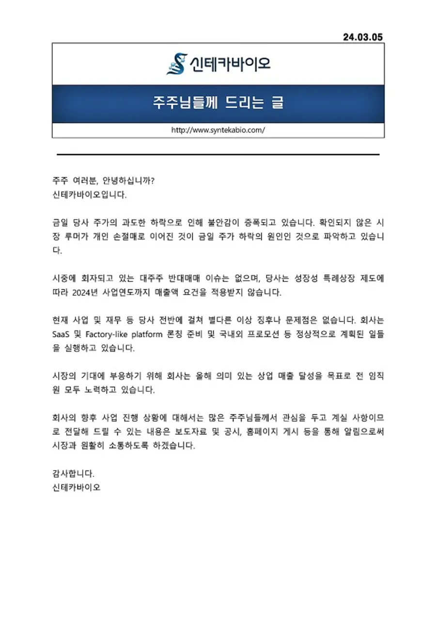 신테카바이오는 5일 "시중에 회자되고 있는 대주주 반대매매 이슈는 없다"고 밝혔다.
